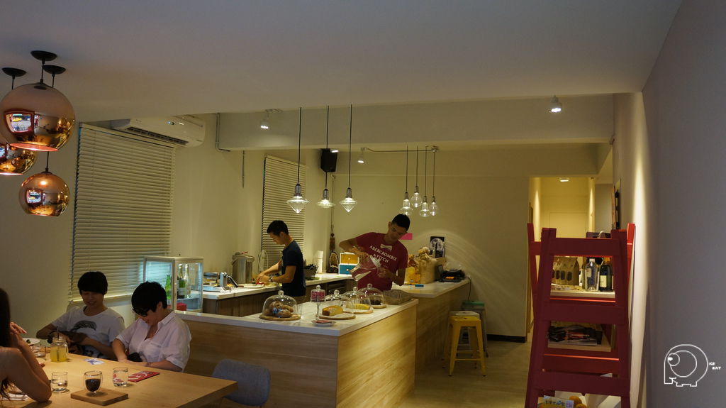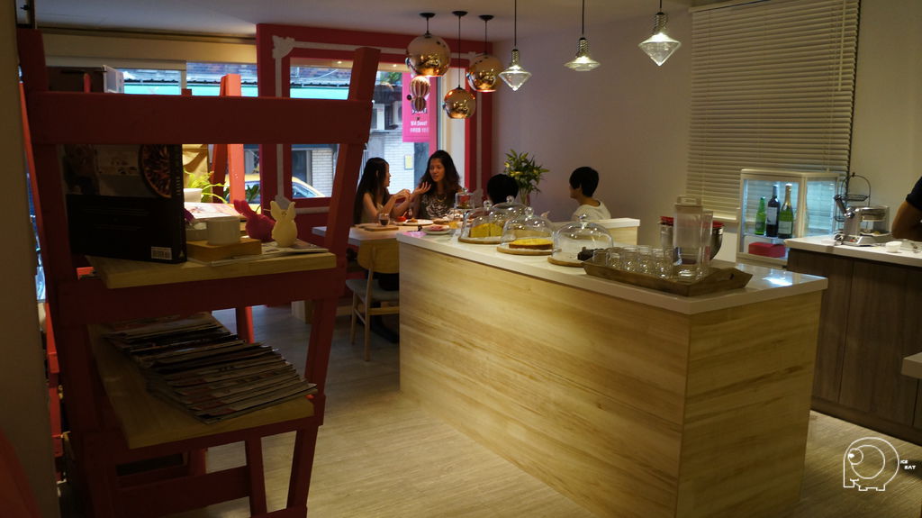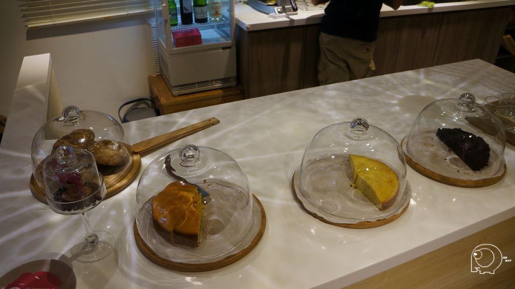 其實只有桃紅色的外觀讓人很難聯想到老闆是個男生,店內簡單但是有巧思的裝潢就很有男士風格了,尤其是一進門大大的工作桌及桌上搶眼的甜點們.從左而右分別是手工麵包,香橙蛋糕,檸檬蛋糕,黑瓜瓜. 手工麵包的酵母也是老闆們自己培養的喔.