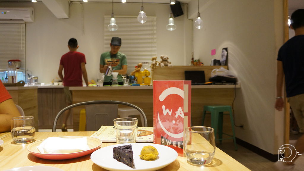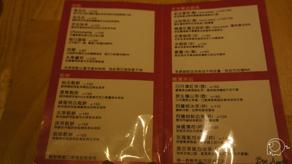 Menu 也是一目了然,分成4區: 甜點,鬆餅,手沖咖啡,精選茶品.蛋糕有黑瓜瓜.金瓜瓜,宇治抹茶,每日蛋糕,奶酪跟水果優格,蛋糕建議大家直接去蛋糕桌選,像我們去的時候有的已經賣光了,所以我們選了很特別的黑瓜瓜,是地瓜跟巧克力的組合.