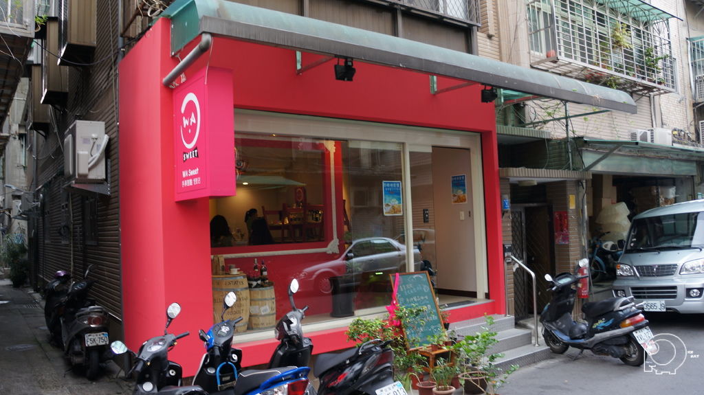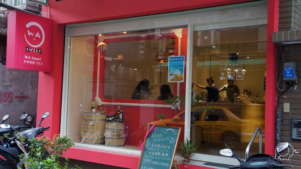 從巷口就可以看到這家桃紅色的手弄甜點的招牌,一個笑臉寫著他們的店名WA,走進門口的木桶放著咖啡豆跟酒,木桶上面是最近很夯的紅白相間的熱氣球,這熱氣球跟最近LV的裝潢也很類似喔,再加上桃紅色相框的感覺,這是真是一間很可愛的店.