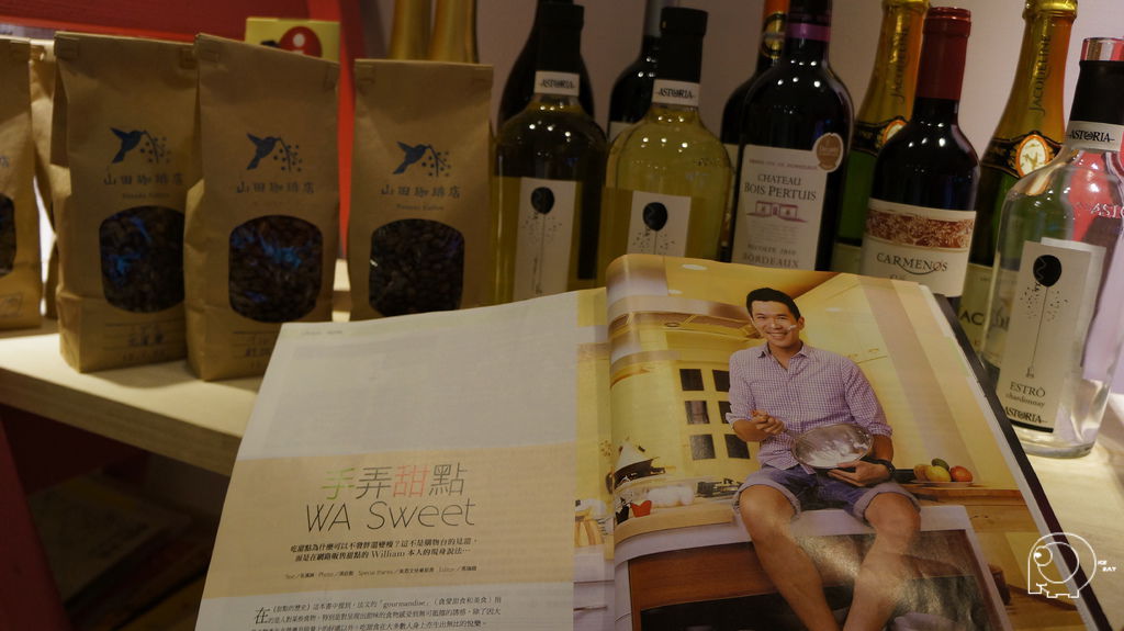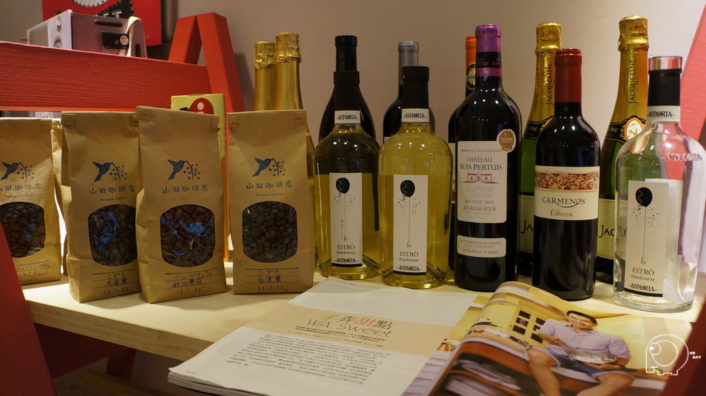 美姬最喜歡的是擺放名片以及下面相片中的紅色架子上的電話機,這架子的第二層有一些餐飲相關的書籍跟雜誌,老闆是有挑過的喔,美姬在這些雜誌看到幾間好想去的店.櫃子上還有擺放一些酒,跟店內使用的咖啡豆.