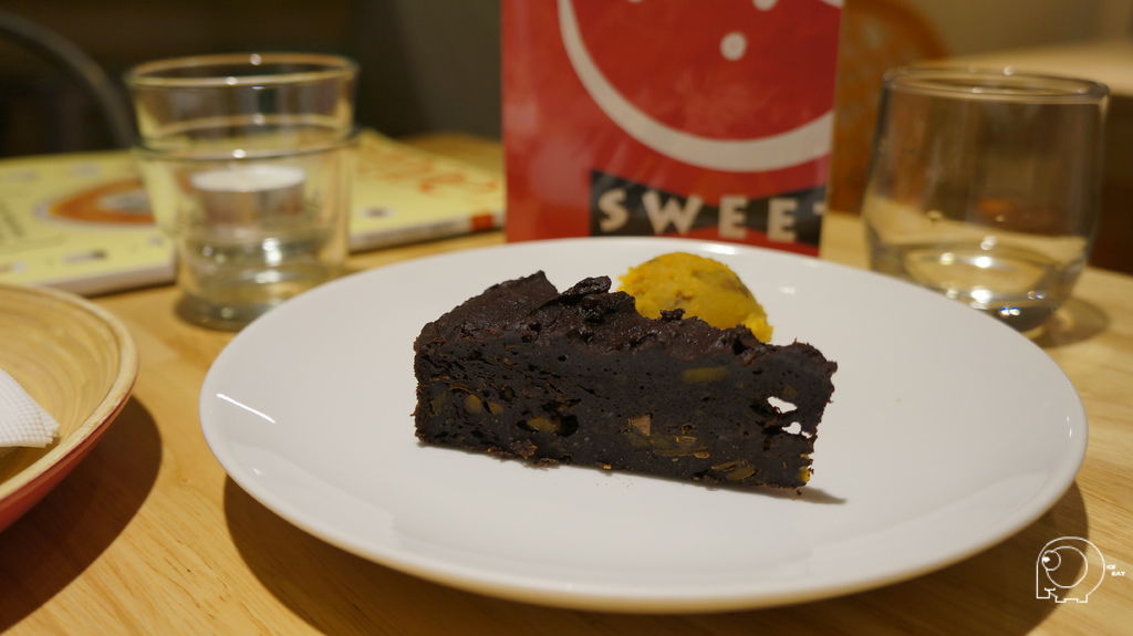 老闆將台灣的食材地瓜與巧克力結合做成了黑瓜瓜,還附上一球地瓜泥,黑瓜瓜吃巧來有點像是布朗尼,少了美姬不愛的核桃,不過對於吃慣高濃度巧克力的美姬來說巧克力的味道有點不夠濃郁,而對老K來說,他就不會覺得巧克力不夠濃.大家一致都很喜歡地瓜泥,甜而不膩.