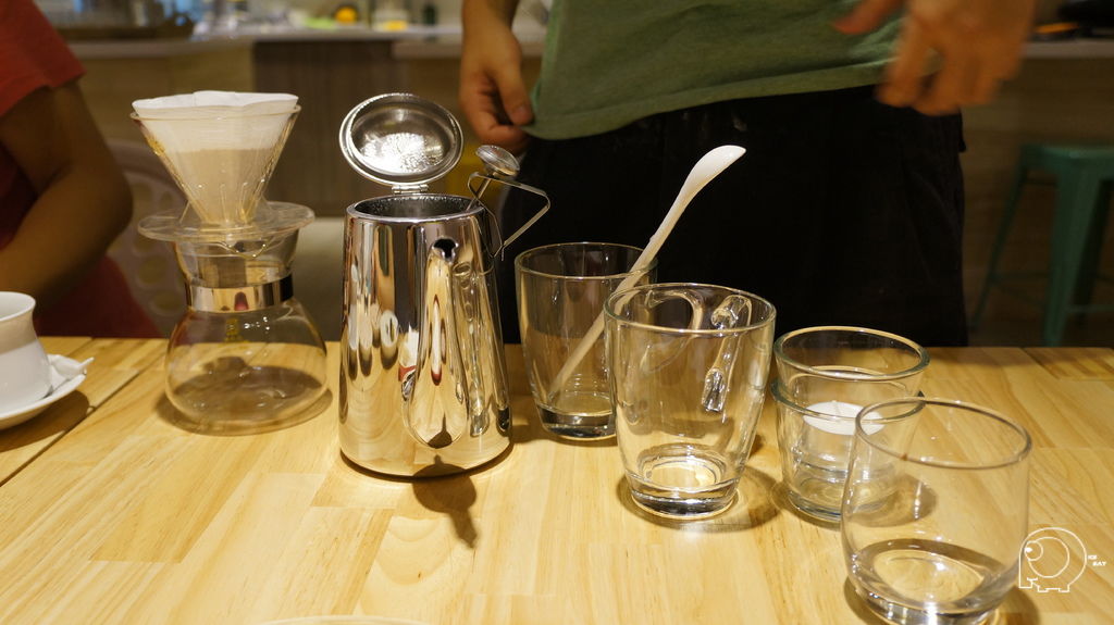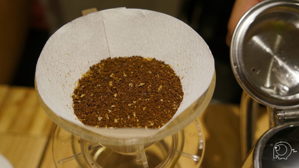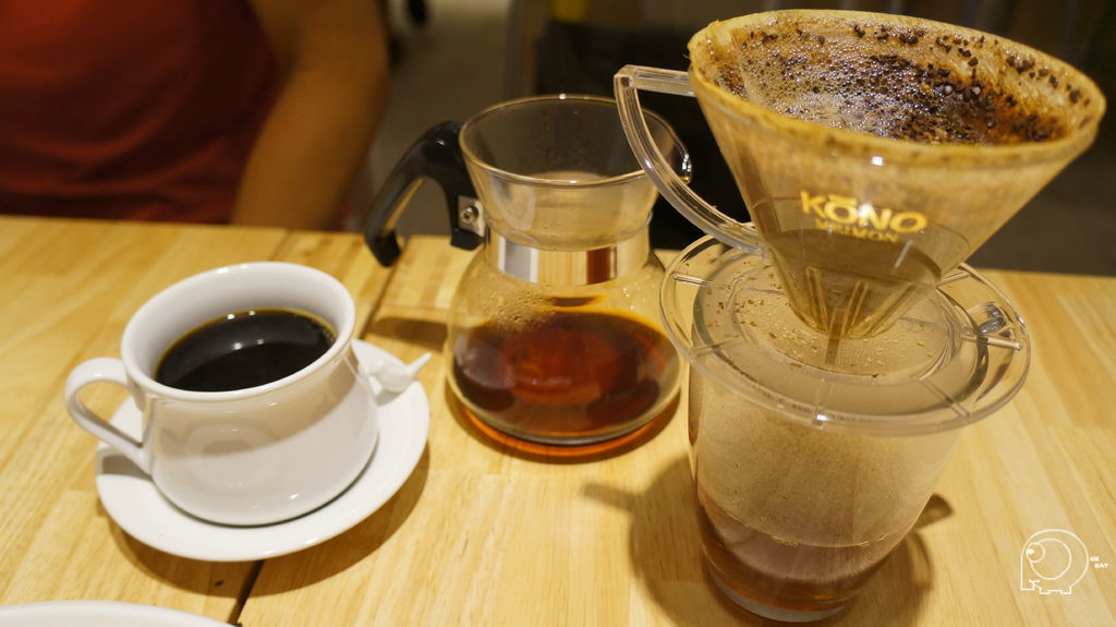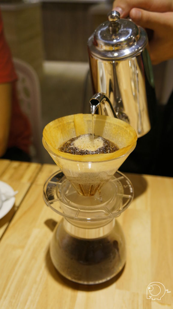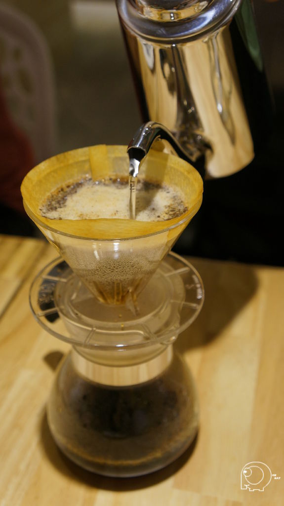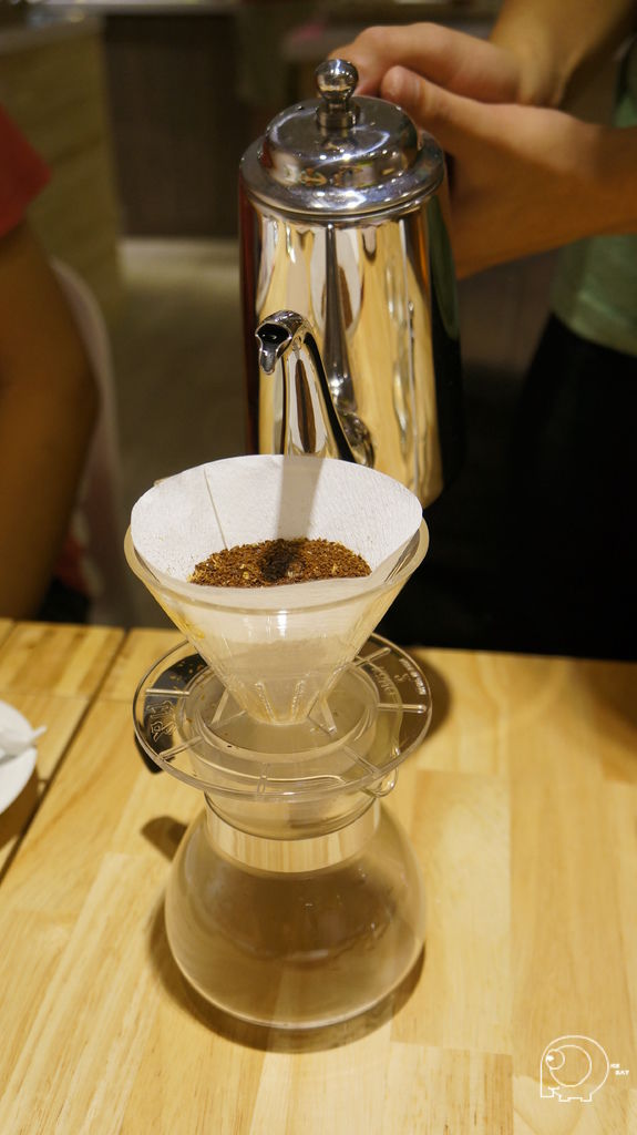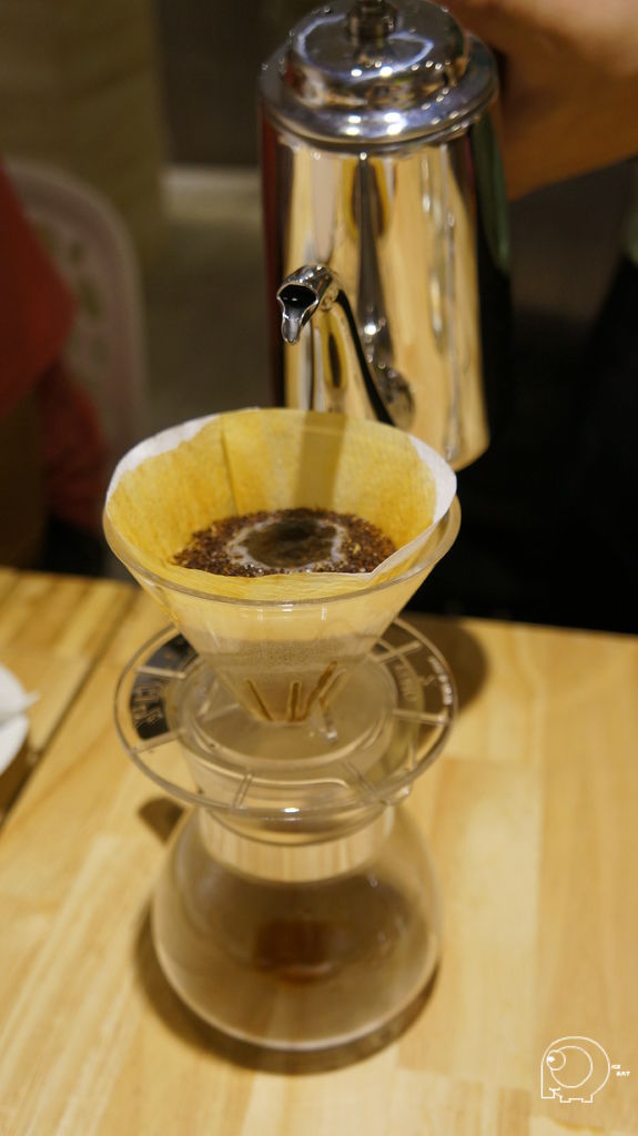 接下來就是要用水滴狀一滴一滴的方式用水慢慢地將咖啡豆浸溼,等到咖啡開始滴落後,就可以換成小水柱繞圈,最後再用大水柱將雜質沖出,所以手沖咖啡的咖啡因含量是很少的,所以不用擔心太晚喝會睡不著,也因為這樣的手沖方式,手沖一杯大約需要4~5分鐘,因為那天店內一進門的大桌,以及後面的VIP room都是人,所以我們等了一陣子.這手沖咖啡的方式,跟之前去丹家(買咖啡豆的好的地方-丹家咖啡@港墘站@內科園區)買咖啡時,老闆的咖啡教學方式有點異曲同工之處,是一個需要時間跟耐心的沖咖啡方式.