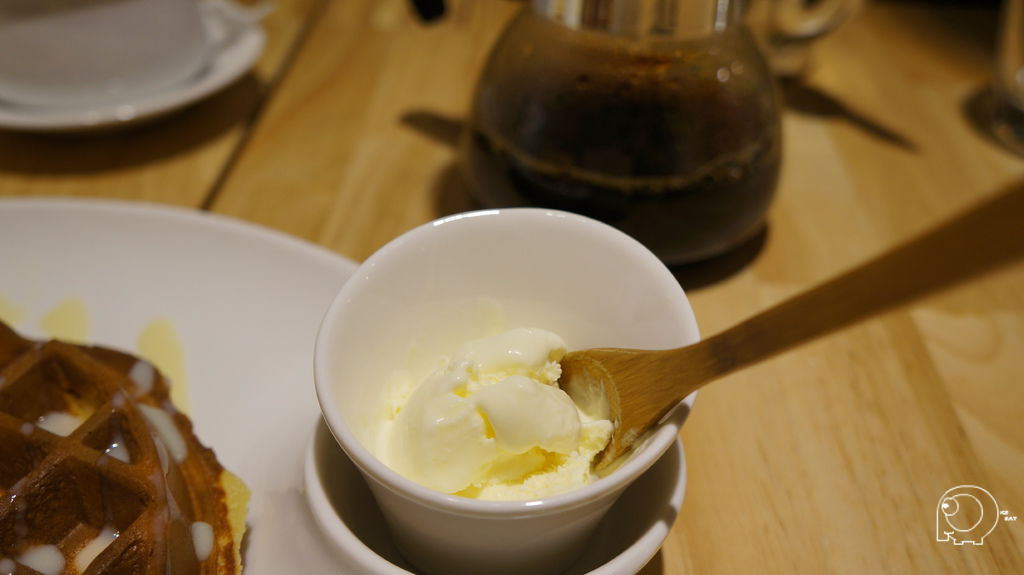 接下來就是換新鮮芒果上場囉,除了新鮮現切芒果外,上面還淋了濃稠的芒果醬,外加老闆自製的冰淇淋,這冰淇淋有著滿溢著濃濃的牛奶味,對於很怕牛奶的美姬與老K而言,這就交給K姊拉.鬆餅與芒果醬再加上新鮮芒果別有一番風味.