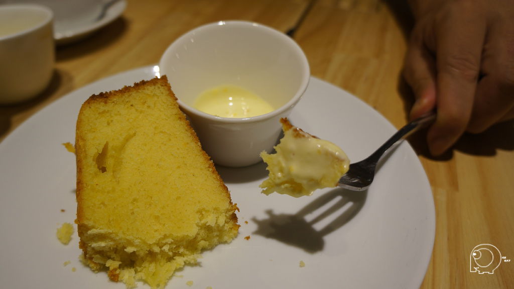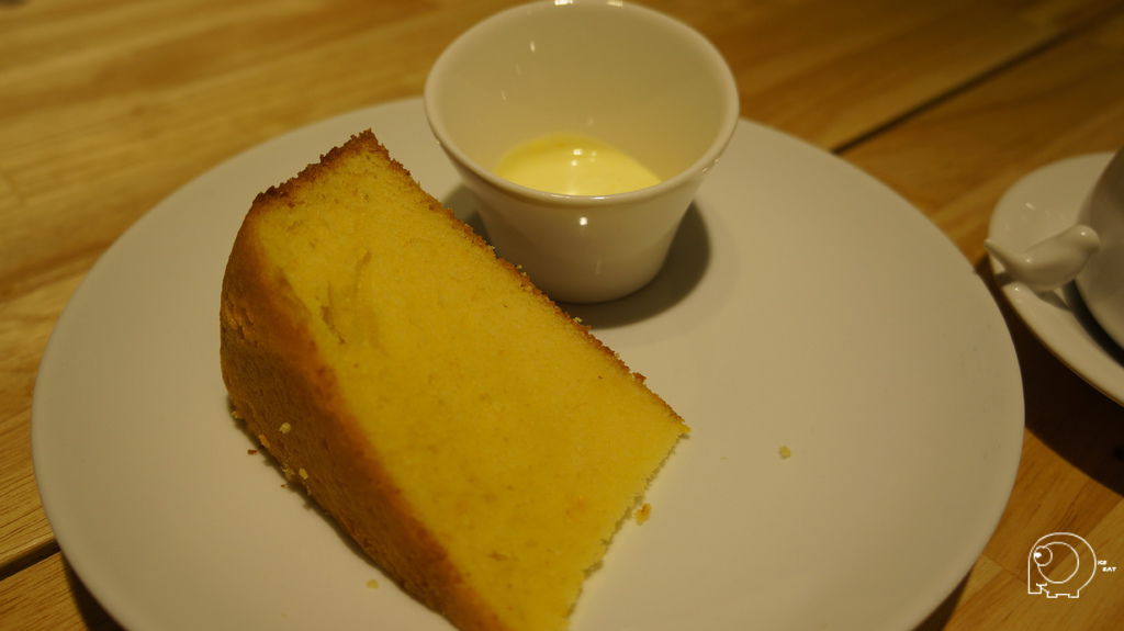 接下來是香橙口味每日蛋糕,乍看之下很像磅蛋糕,老闆說這只有看起來像,他們的做法是比較接近戚風蛋糕,所以吃起來不會像磅蛋糕,那麼油那麼容易膩,因為蛋糕本體吃起來有比較乾,但是沾著香橙醬一起吃,滿口都是濃濃地香橙味,就很美味了,也很適合配單品咖啡.